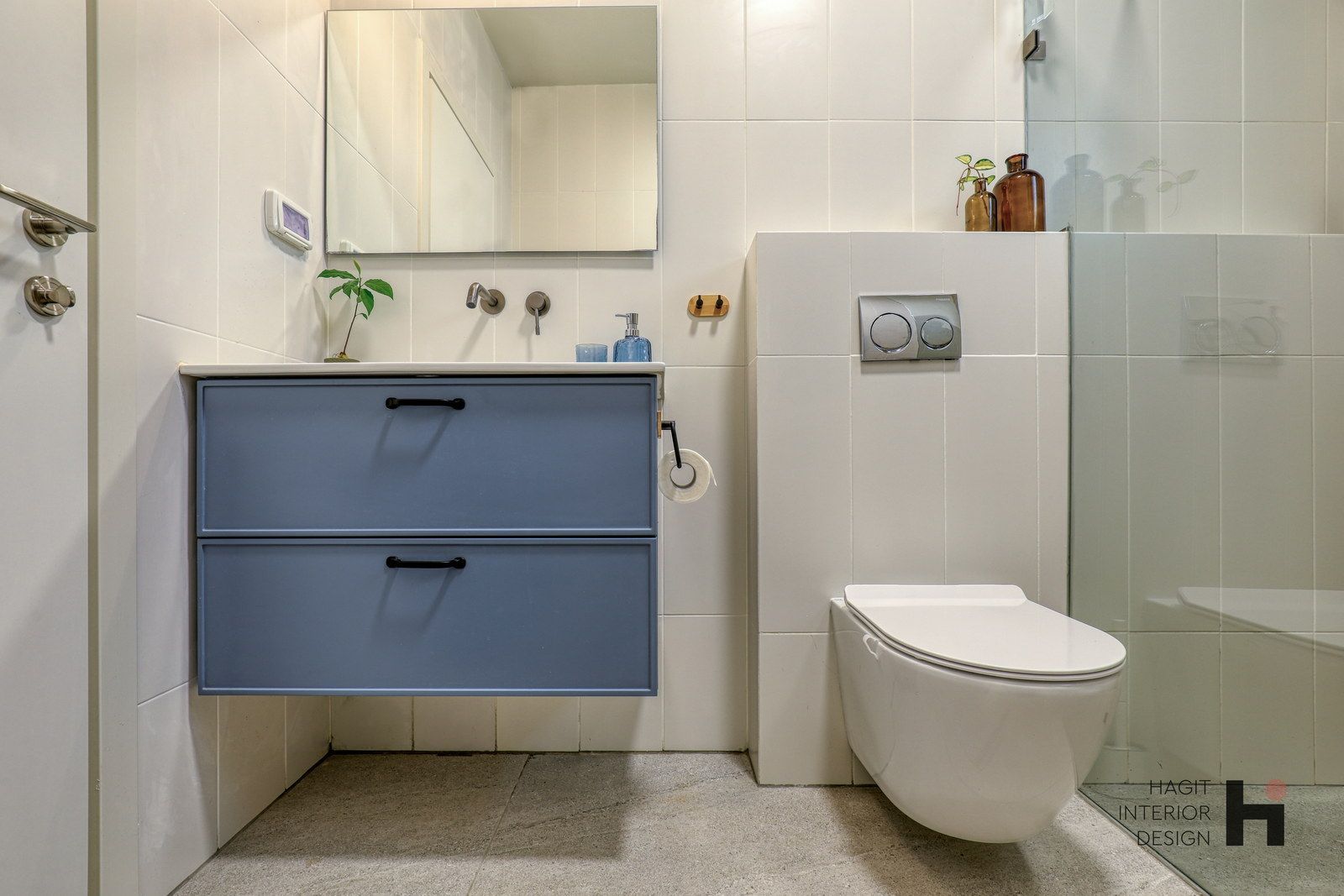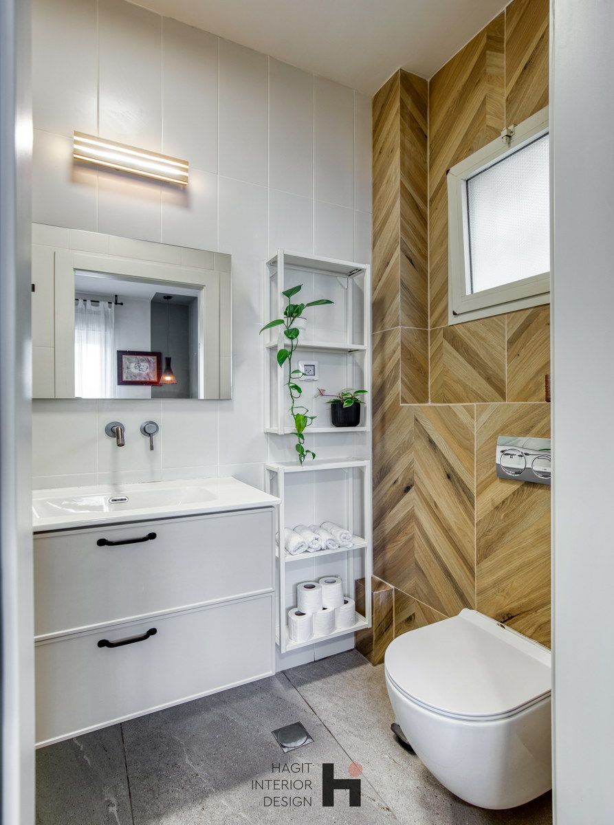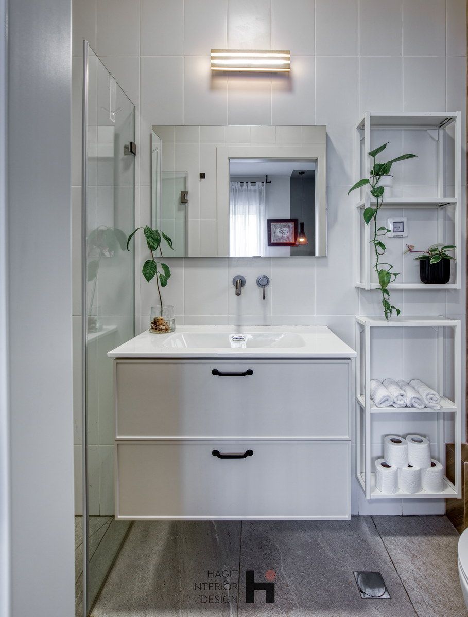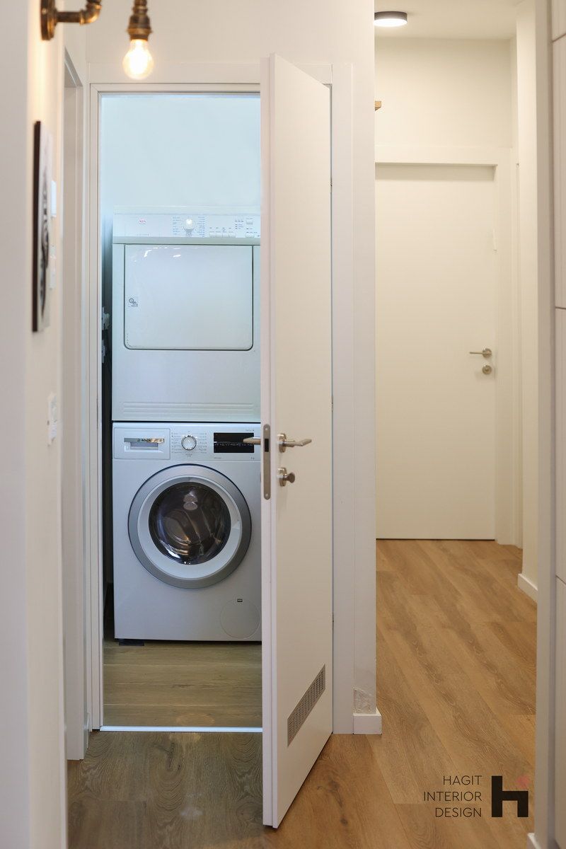 בתהליך חשיבה משותף הפרדנו את חדר הרחצה הכללי ממכונת הכביסה והמייבש ויצרנו עבורם חדרון נפרד ופרקטי. תכננו נישה לארון כניסה לבית שבעלת הבית מאוד רצתה ותוכנן בהתאם למידות ארון של איקאה על מנת לחסוך בעלויות נגר.